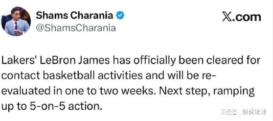 曝詹姆斯已被批准进行对抗性训练 1-2周内接受重新评估