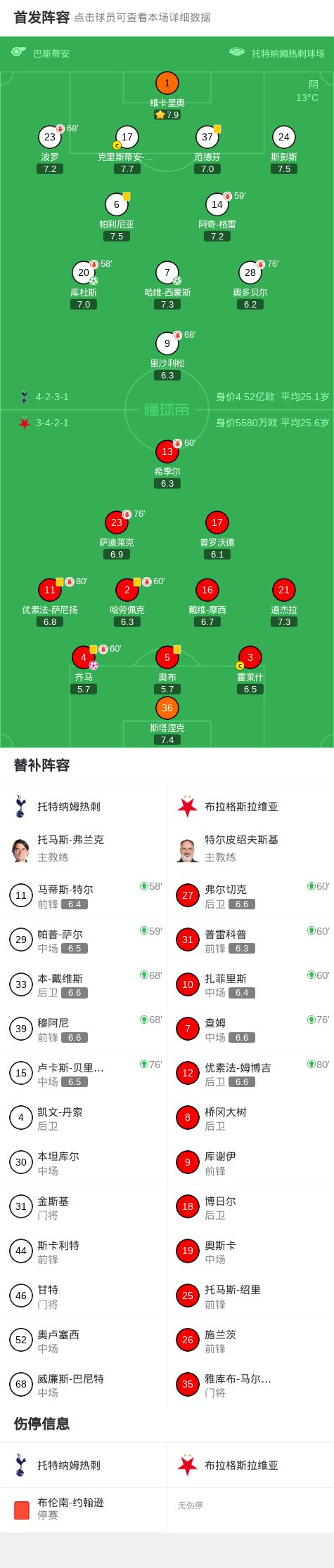 北京时间12月10日,欧洲冠军联赛联赛阶段第6轮,托特纳姆热刺迎战布拉格斯拉维亚。上半场,罗梅罗制造齐马自摆乌龙。下半场,萨尼扬飞铲送点,库杜斯主罚命中。哈维-西蒙斯造点,并亲自操刀命中。全场比赛结束,热刺3-0战胜布拉格斯拉维亚。